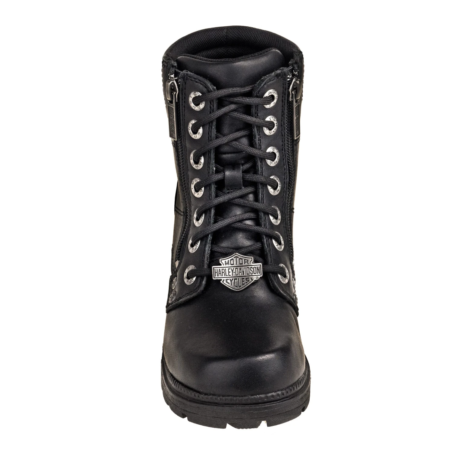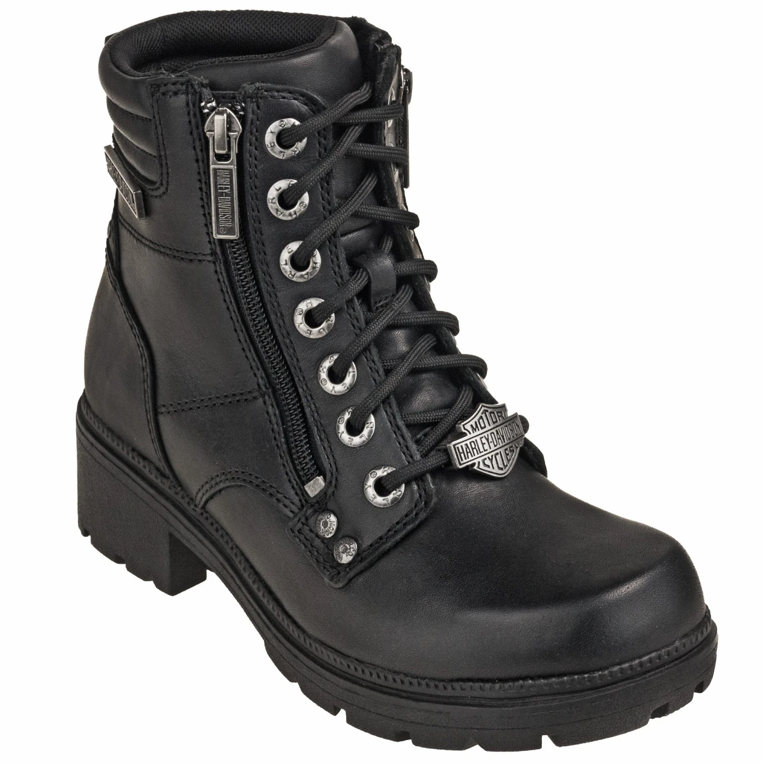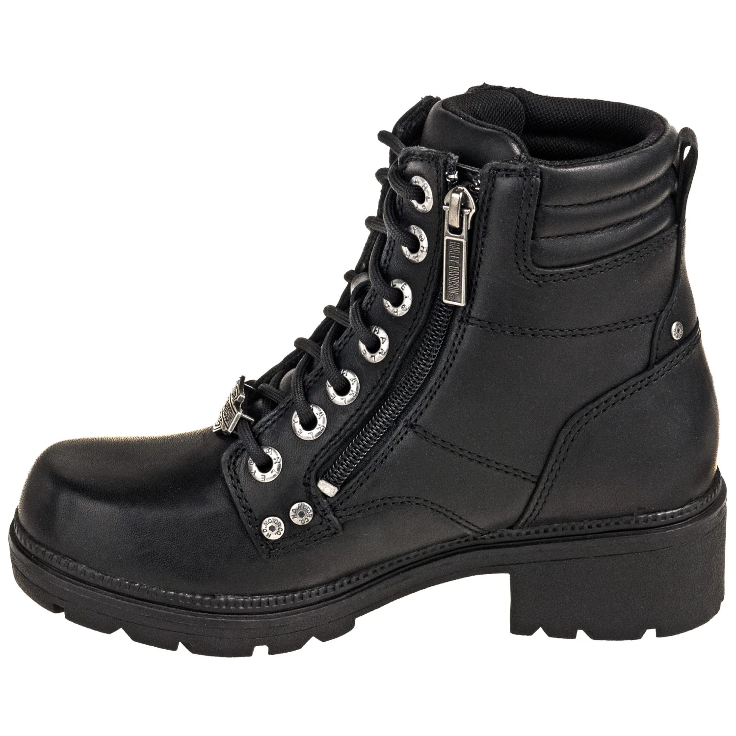 Add to your black leather collection with these Harley Davidson Women’s D83877 Zip Up Black Motorcycle Boots. They’ll keep your feet looking cool and feeling comforted, and they’re durable, too. With laces, zippers, black leather, a tall shaft, and a short heel, you’ll stun as you glide down the road.