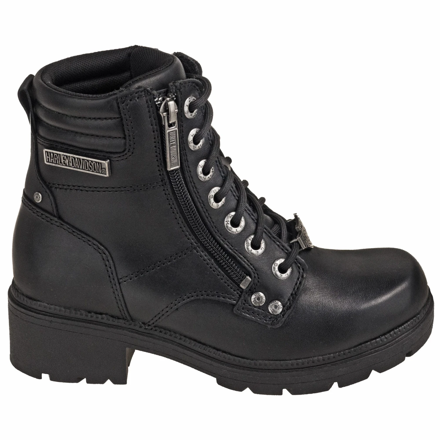 These women’s black leather boots by Harley Davidson are sophisticated and cool, but it all comes down to their design and shape. They feature a round toe and are 6.75 inches tall. The shaft stands 5.25 inches tall, while the heel has a height of 1.5 inches. The upper and outsole are black and appear sleek. Plus, the black color means they can match any outfit you decide to don. They include a Harley Davidson Bar & Shield badge on the bottom lace and on the outside rear quarter of the shaft, so you can always represent a brand you love. These women’s boots are also lace-up. They have cord lacing with seven logo eyelets, but you won’t have to lace them up. These zip up black boots are made with exposed twin YKK locking zippers that feature pull tabs for easy put-on and take-off. Think of the laces as an addition in style. Lastly, the bottom of the sole has an orange Harley Davidson Bar & Shield logo. The touch of orange along with the various logos and the tough, attractive exterior really make these really feel like a Harley Davidson creation.