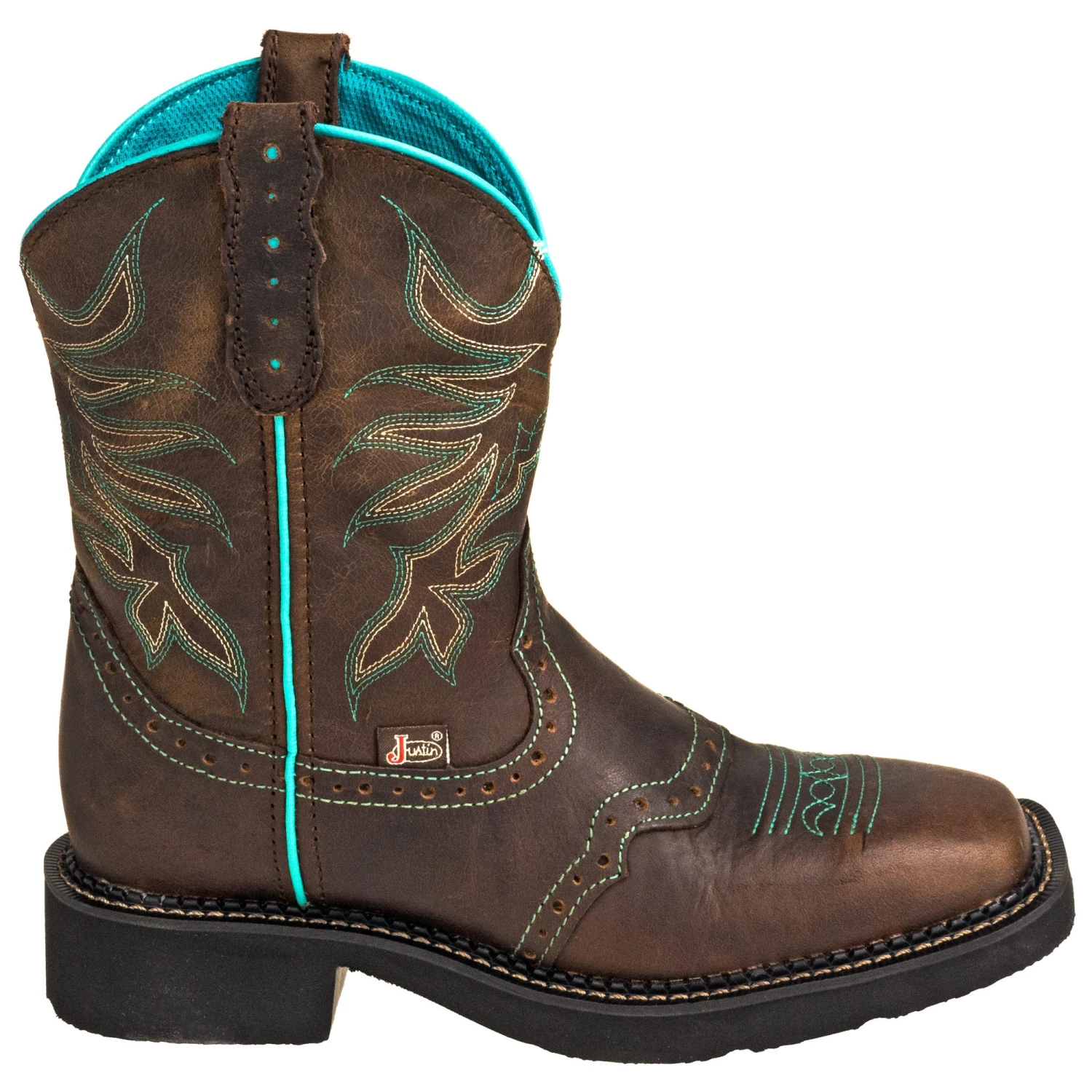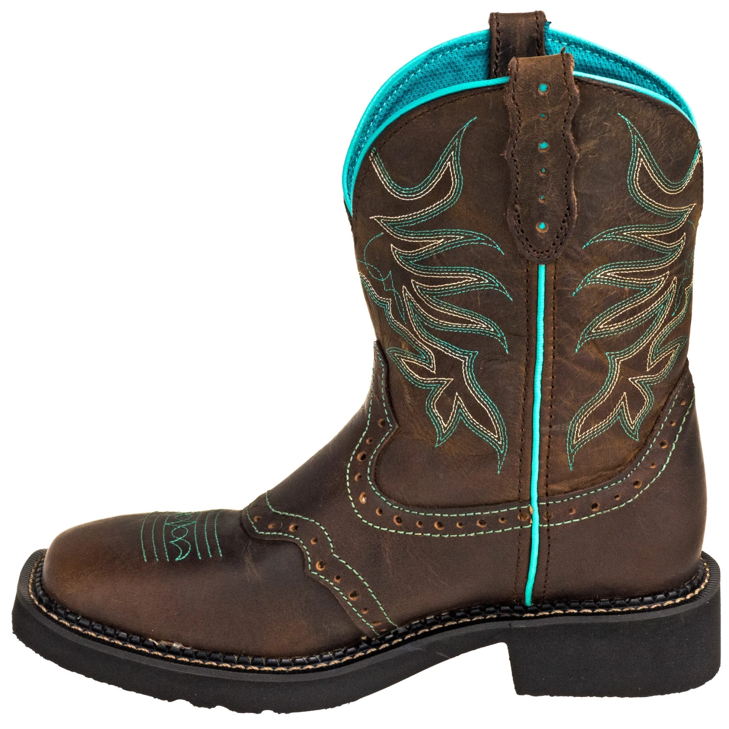 Whether you’re heading out to the barn or to a barn dance, you can enjoy the full package with these women’s cowboy boots: they’re cute, they’re comfortable, and they’re ready for anything. The 8-inch Chocolate Puma leather uppers are shorter than traditional cowboy footwear. The dark brown leather is accented with eye-catching turquoise stitch patterns and outer seams. The interiors are also lined with this beautiful turquoise linings. The leather is designed to look good while working hard, allowing your chocolate brown leather boots to flex comfortably as you move and hold up under the pressures of whatever your day has in store. The J124 wide square toe boxes offer plenty of wiggle room for your little piggies while offering the stylish, modern square toe design.