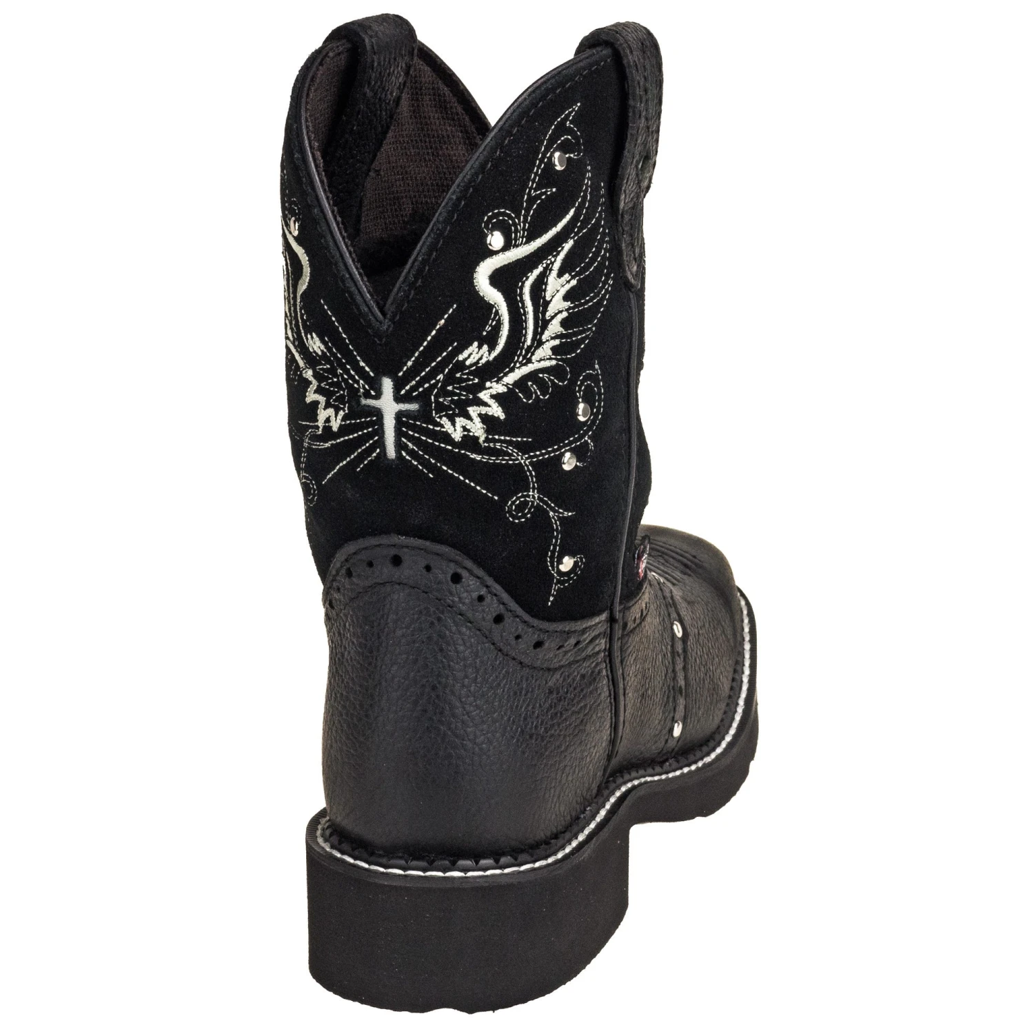 Black deercow leather with rhinestone accents make up the feet of the uppers on these black cowgirl boots. The shaft is crafted from black suede with a decorative white stitch pattern. This begins with a cross at the center above the polished perforated saddle vamp and proceeds out on both sides with angels wings and decorative styling. Rhinestones accent the shaft as well. The deep cut-away top and black leather finger pulls with cut away white diamond pattern add another touch of intrigue to this short women’s cowboy footwear. With all that’s going on with these classy cowgirl Justin boots, between the smooth shiny leather feet, sparkly rhinestones, and textured decorative suede, you’re sure to be noticed!