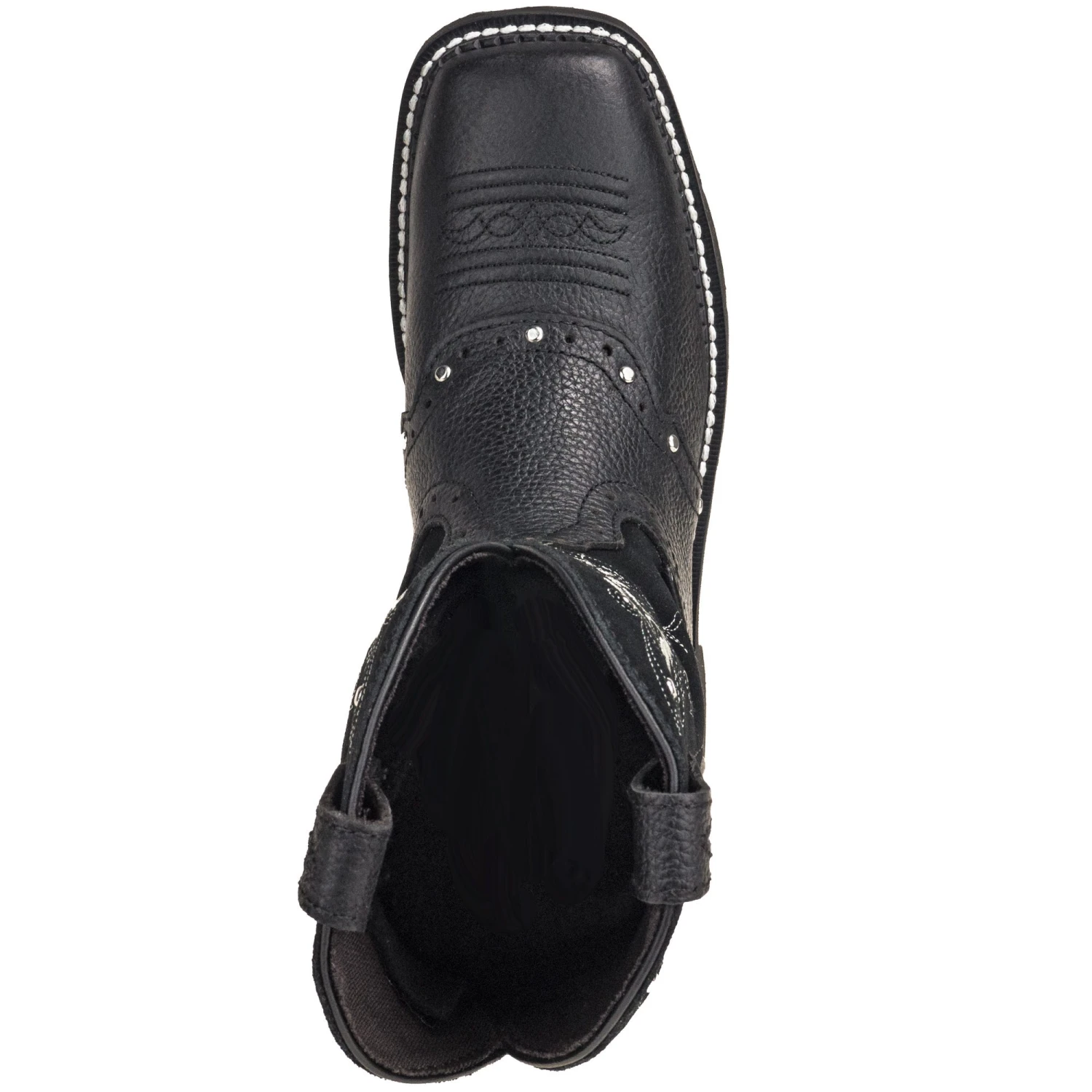 The J124 wide square toes on these Mandra black boots offer a fashionable look with plenty of room for comfort. The J-Flex Flexible Comfort System inside these rhinestone 8-inch women’s boots include removable orthotic inserts to ensure you can enjoy your day with plenty of cushion and support under your feet. As you work or play in these stunning dark decorative cowboy boots, the J-Flex system uses multi layers of cushion to support your feet where they need it and also to reduce the shock of impact as you walk. The ergonomically designed orthotic inserts target key areas of your feet for the best support possible. The black rubber outsoles blend right in with the Justin footwear and offer fashionably functional grip and traction. Constructed with the single stitch welt, these sturdy leather boots will keep you on your feet, in the saddle, or firmly on the pedals with the one piece molded unit heels – which are wider and flatter than traditional heels.